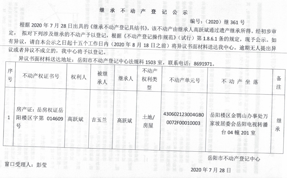 继承(受遗赠)不动产登记公告(高跃斌)