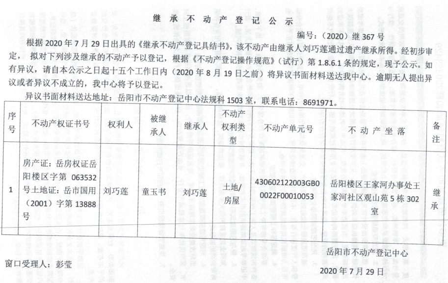 继承(受遗赠)不动产登记公告(刘巧莲)