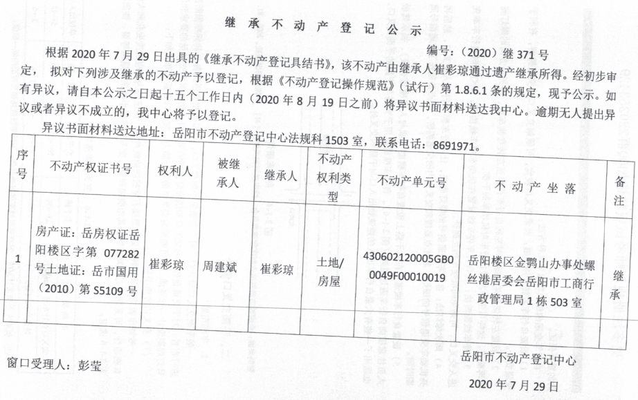 继承(受遗赠)不动产登记公告(崔彩琼)