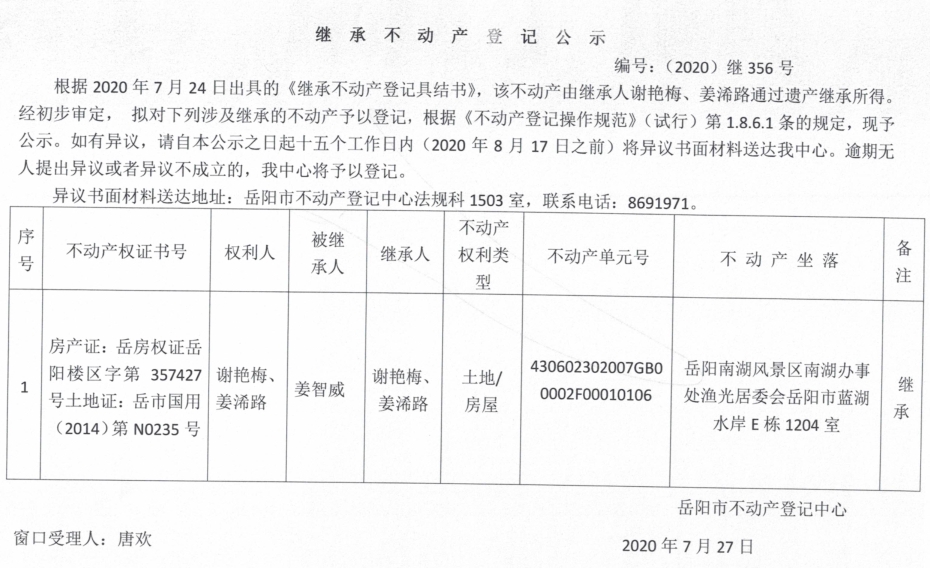 继承(受遗赠)不动产登记公告(谢艳梅)