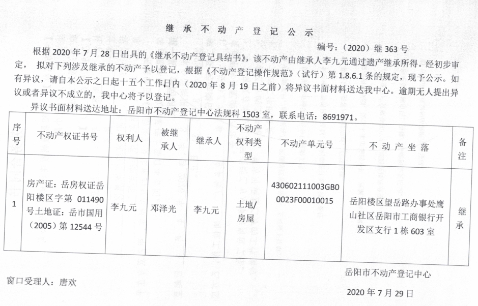 继承(受遗赠)不动产登记公告(李九元)