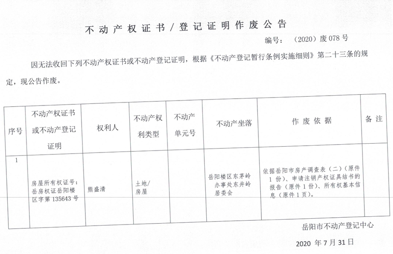 不动产权证书/登记证明作废公告(熊盛清)