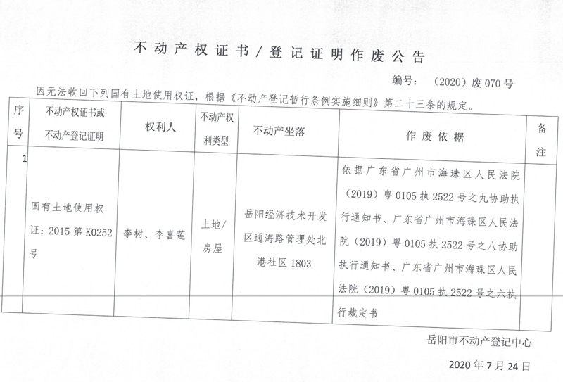 不动产权证书/登记证明作废公告(李树)
