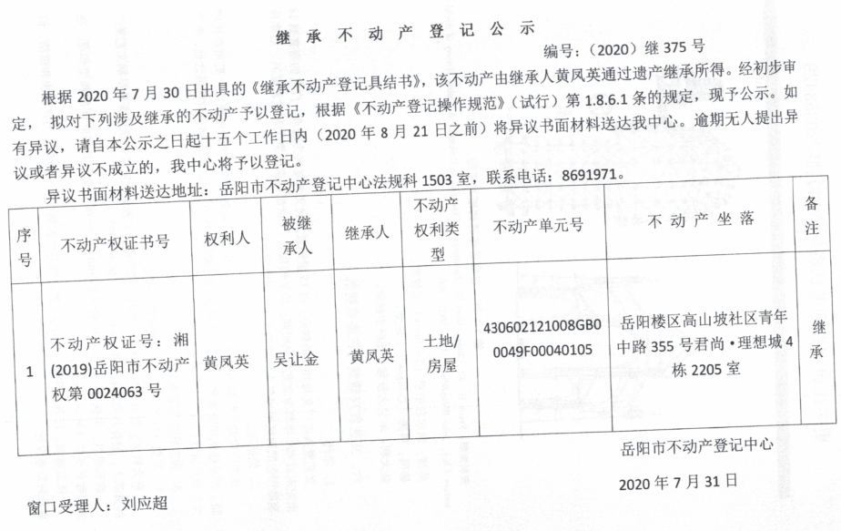 继承(受遗赠)不动产登记公告(黄凤英)