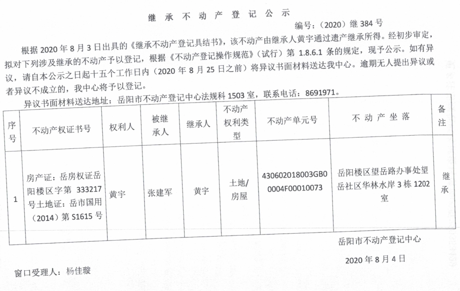 继承(受遗赠)不动产登记公告(黄宇)