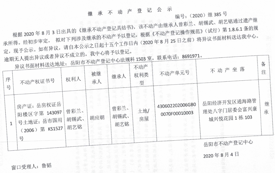 继承(受遗赠)不动产登记公告(胡艺铭)