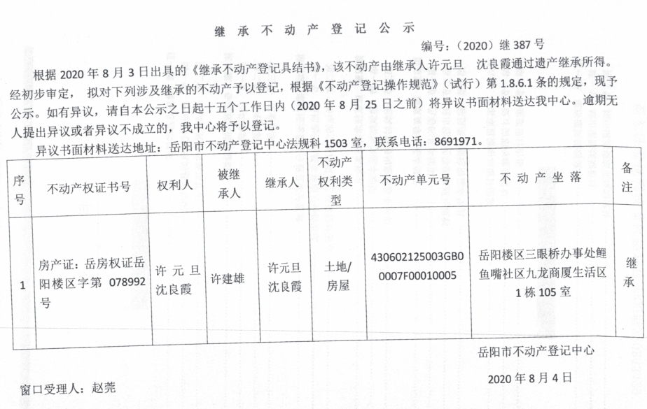 继承(受遗赠)不动产登记公告(许元旦)