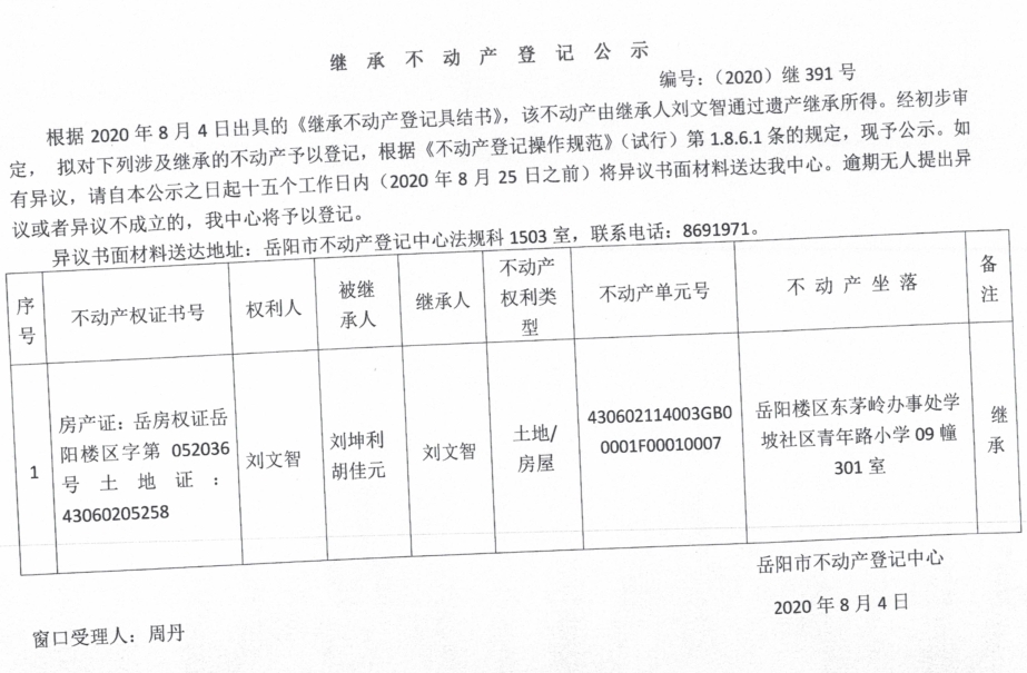 继承(受遗赠)不动产登记公告(刘文智)