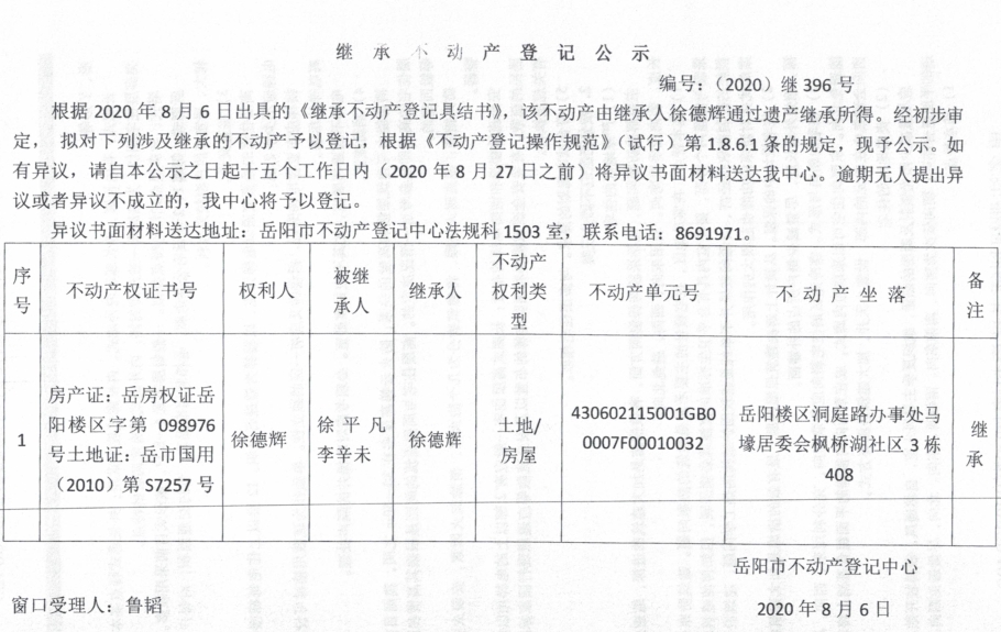 继承(受遗赠)不动产登记公告(徐德辉)