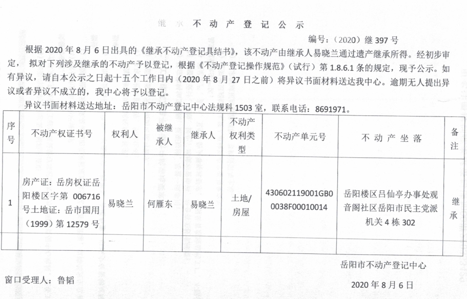 继承(受遗赠)不动产登记公告(易晓兰)
