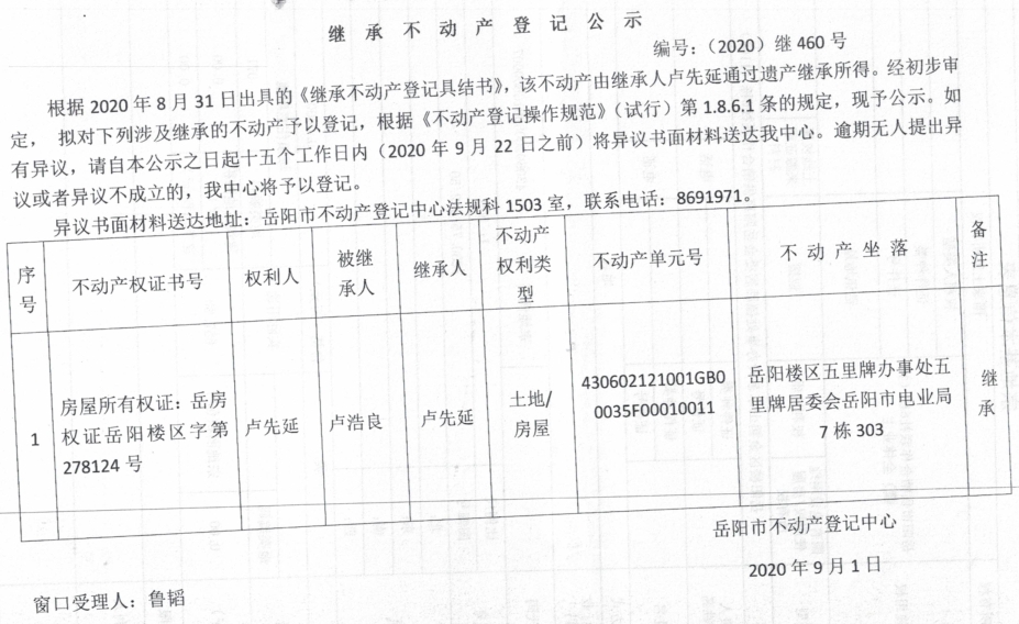继承(受遗赠)不动产登记公告(卢先延)
