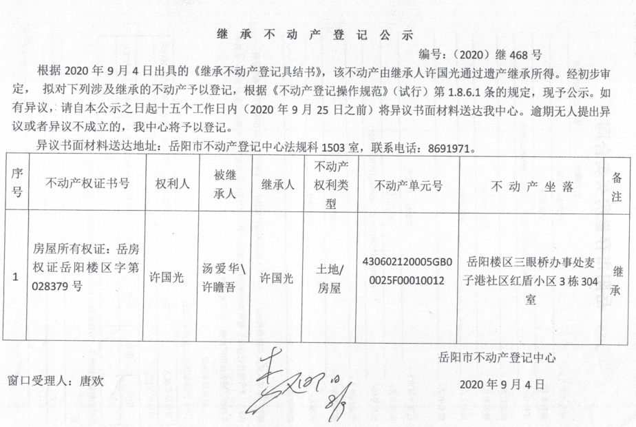 继承(受遗赠)不动产登记公告(许国光)