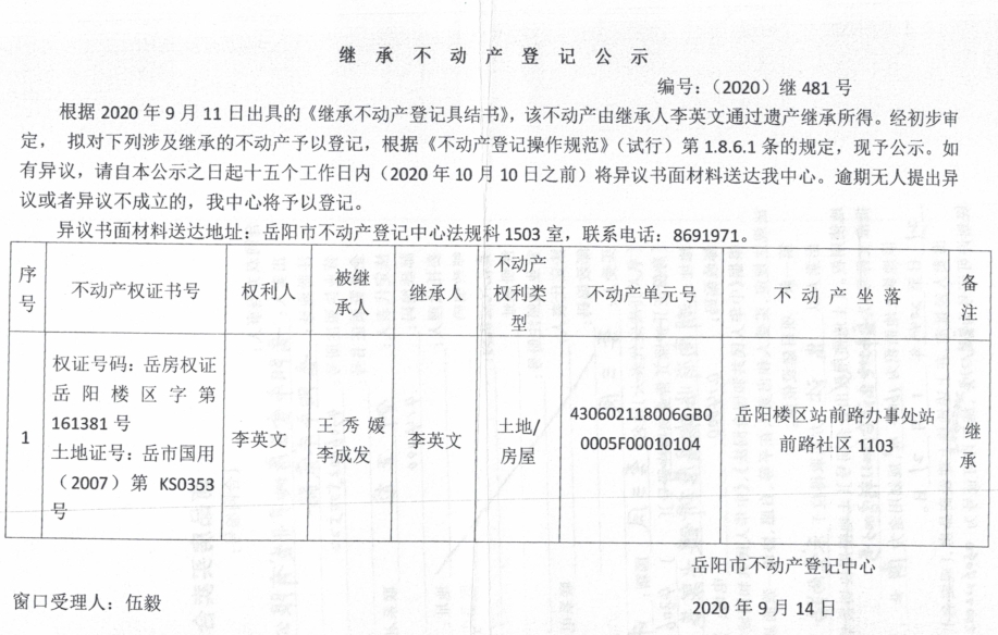 继承(受遗赠)不动产登记公告(李英文)