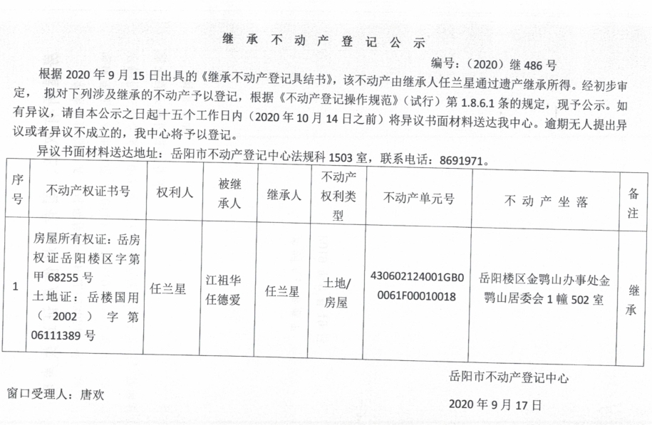 继承(受遗赠)不动产登记公告(任兰星)