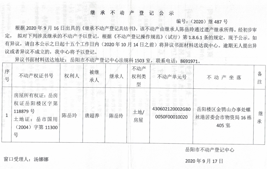 继承(受遗赠)不动产登记公告(陈岳玲)
