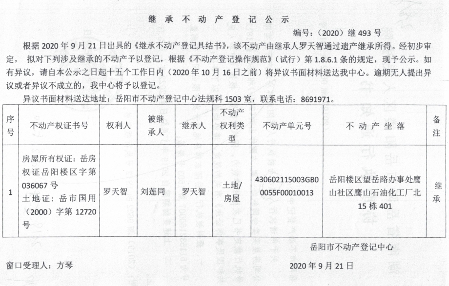 继承(受遗赠)不动产登记公告(罗天智)