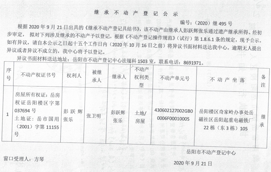 继承(受遗赠)不动产登记公告(彭跃辉)
