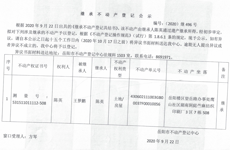 继承(受遗赠)不动产登记公告(陈英)