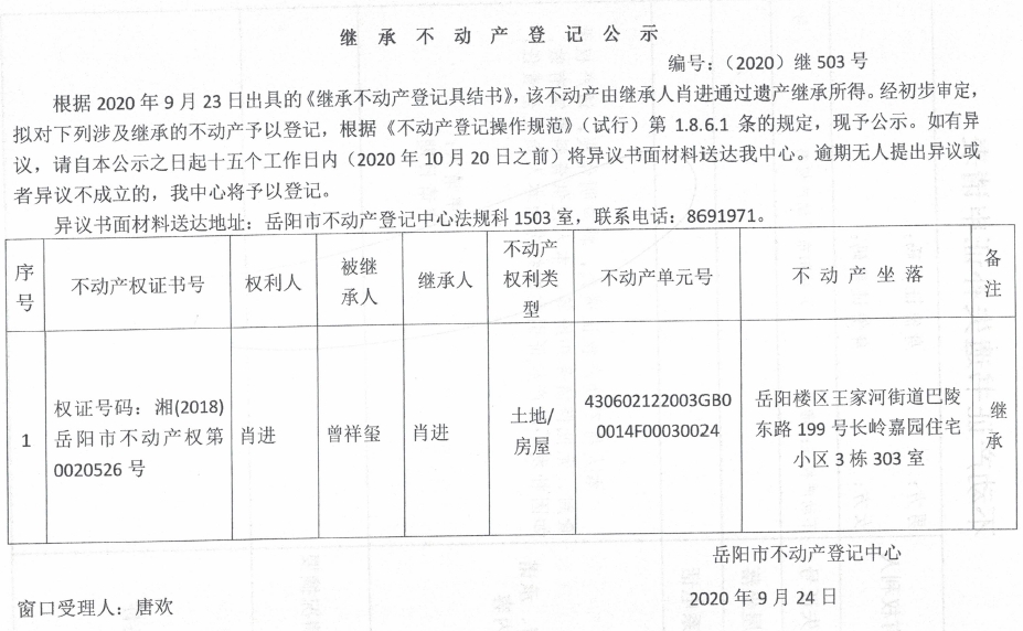 继承(受遗赠)不动产登记公告(肖进)