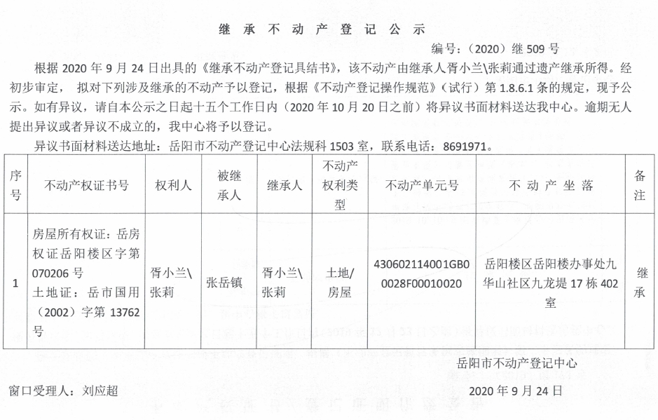 继承(受遗赠)不动产登记公告(张莉)