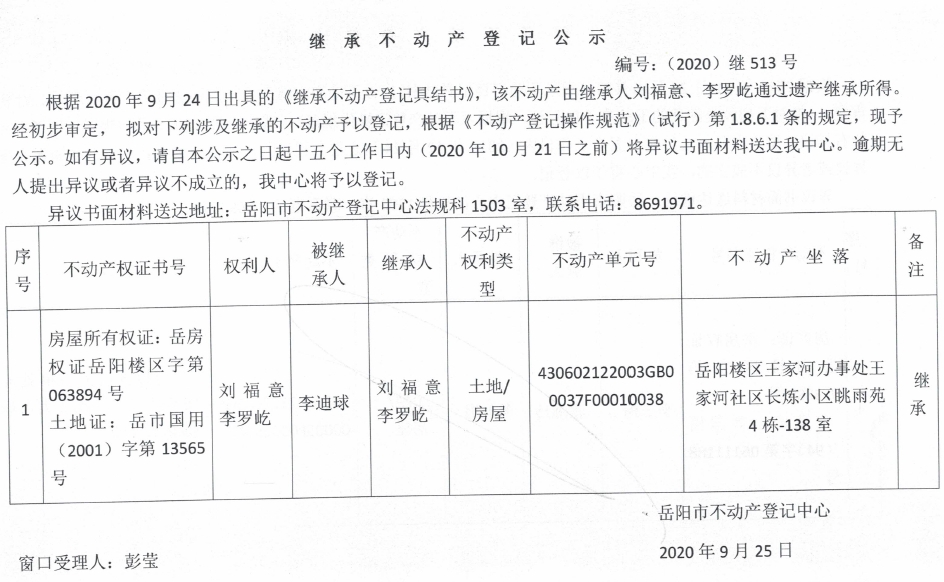 继承(受遗赠)不动产登记公告(刘福意)