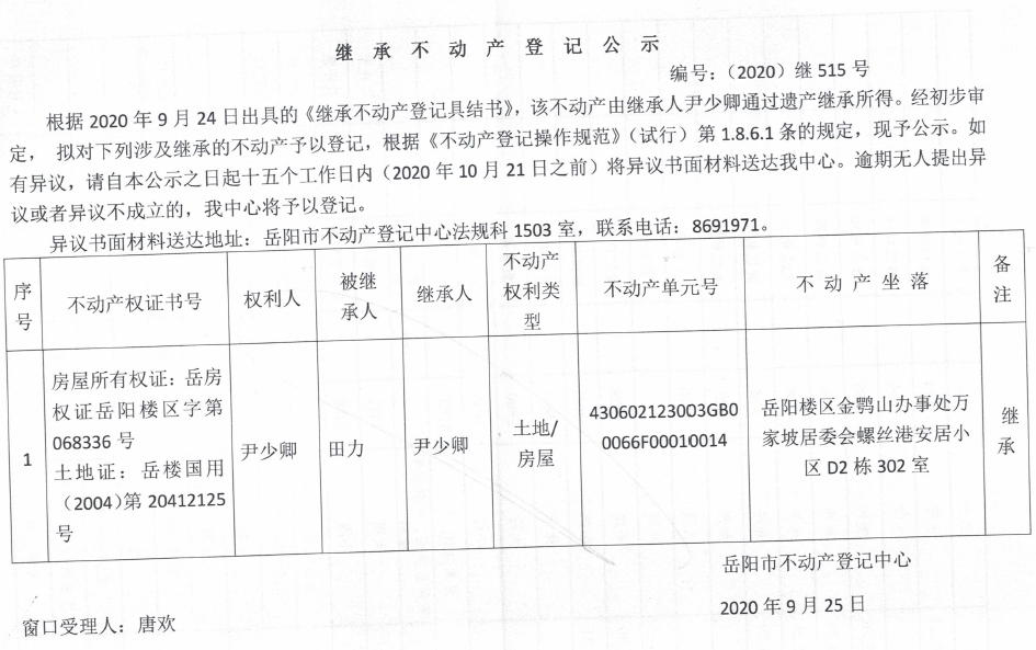 继承(受遗赠)不动产登记公告(尹少卿)