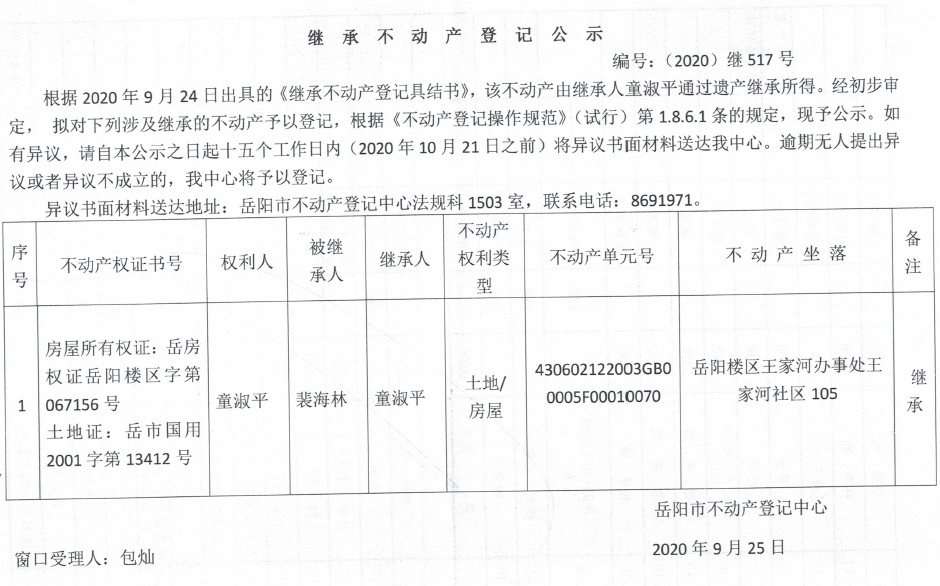 继承(受遗赠)不动产登记公告(童淑平)