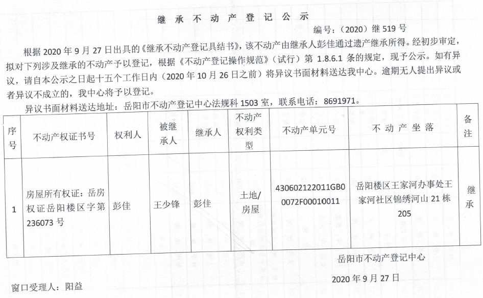 继承(受遗赠)不动产登记公告(彭佳)