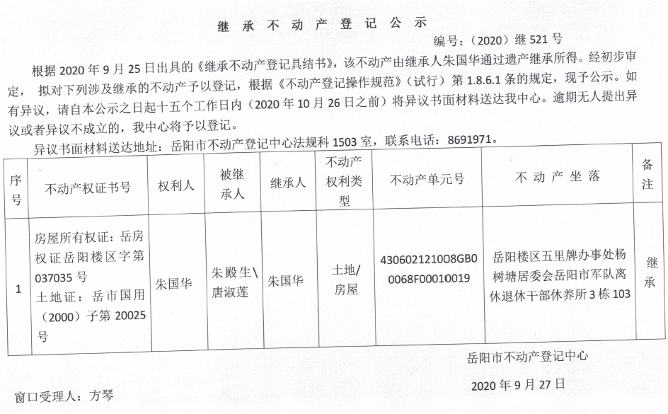继承(受遗赠)不动产登记公告(朱国华)