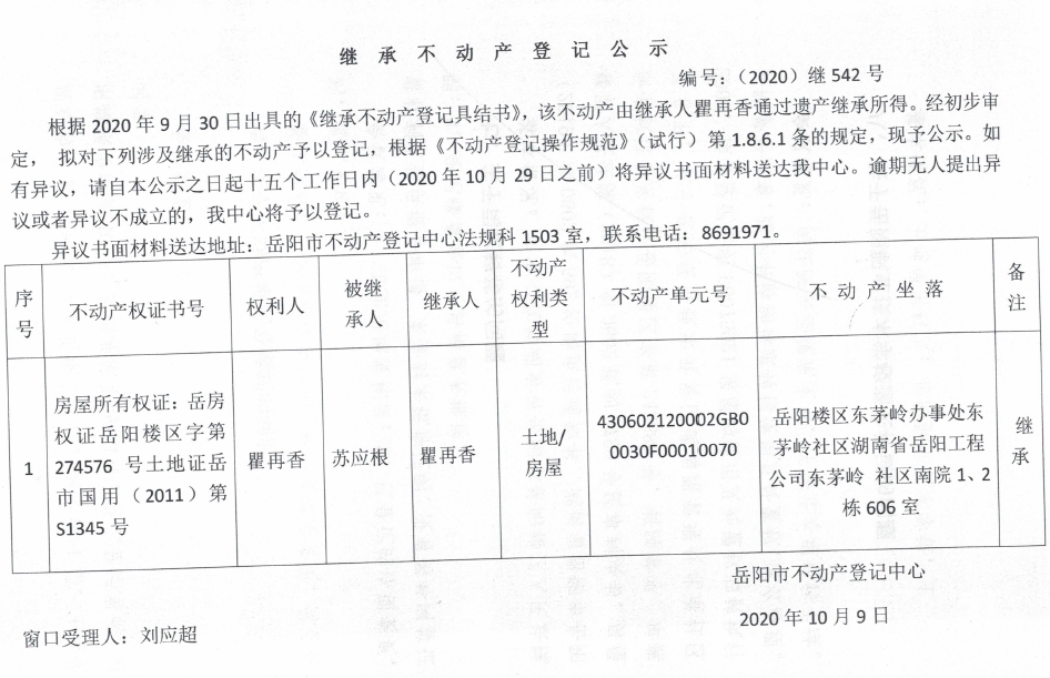 继承(受遗赠)不动产登记公告(瞿再香)