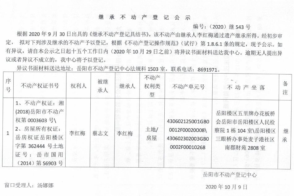 继承(受遗赠)不动产登记公告(李红梅)