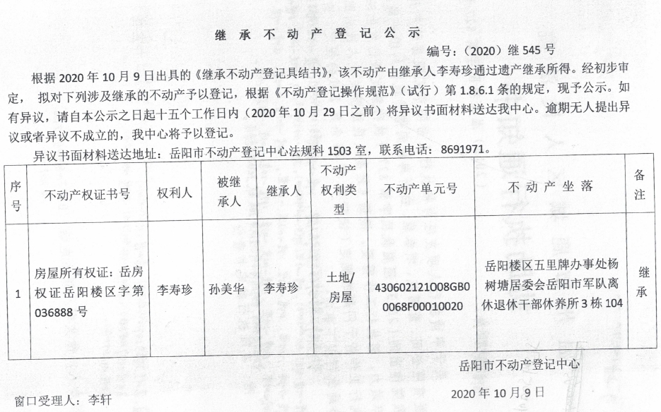 继承(受遗赠)不动产登记公告(李寿珍)