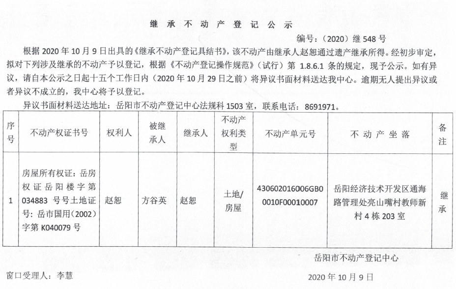 继承(受遗赠)不动产登记公告(赵恕)