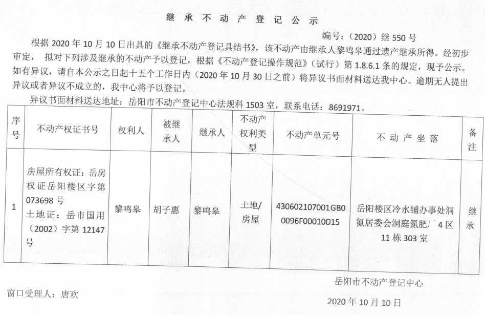 继承(受遗赠)不动产登记公告(黎鸣臬)