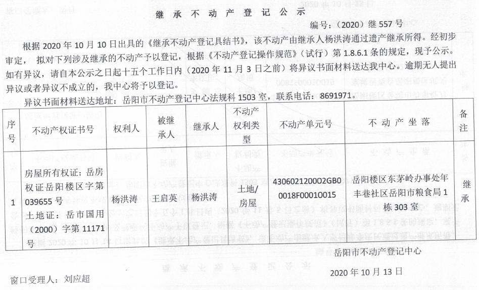 继承(受遗赠)不动产登记公告(杨洪涛)