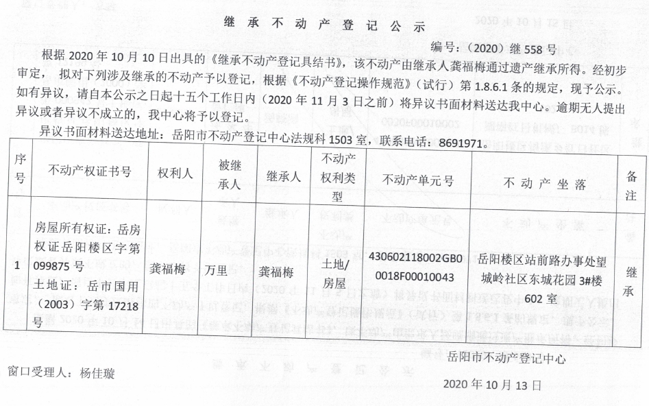 继承(受遗赠)不动产登记公告(龚福梅)