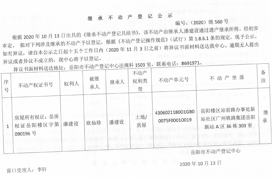 继承(受遗赠)不动产登记公告(潘建设)
