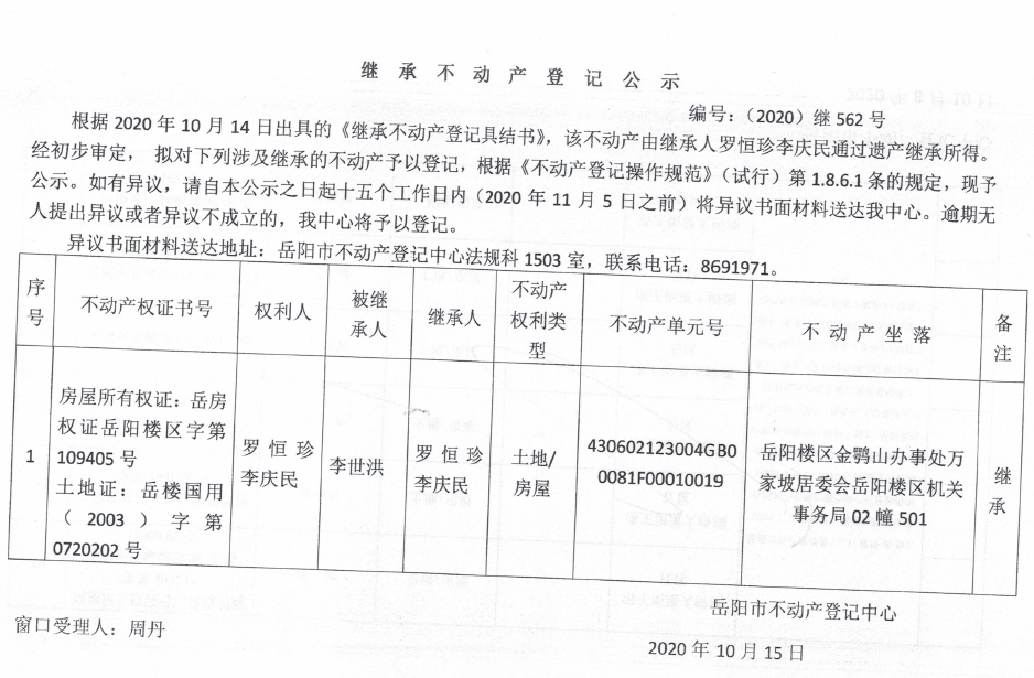继承(受遗赠)不动产登记公告(李庆民)
