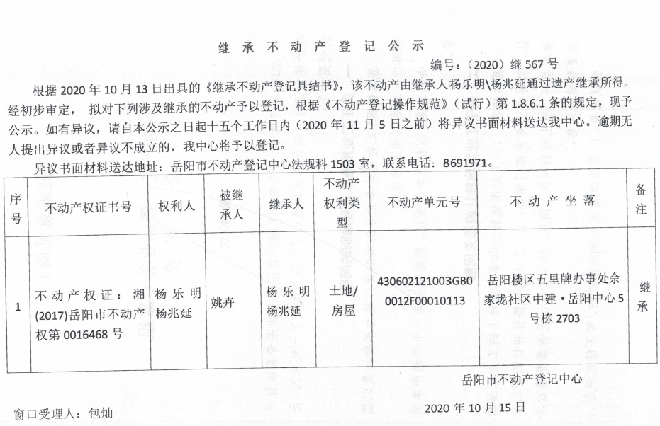继承(受遗赠)不动产登记公告(杨乐明)