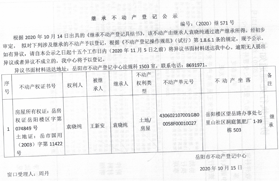 继承(受遗赠)不动产登记公告(袁晓纯)