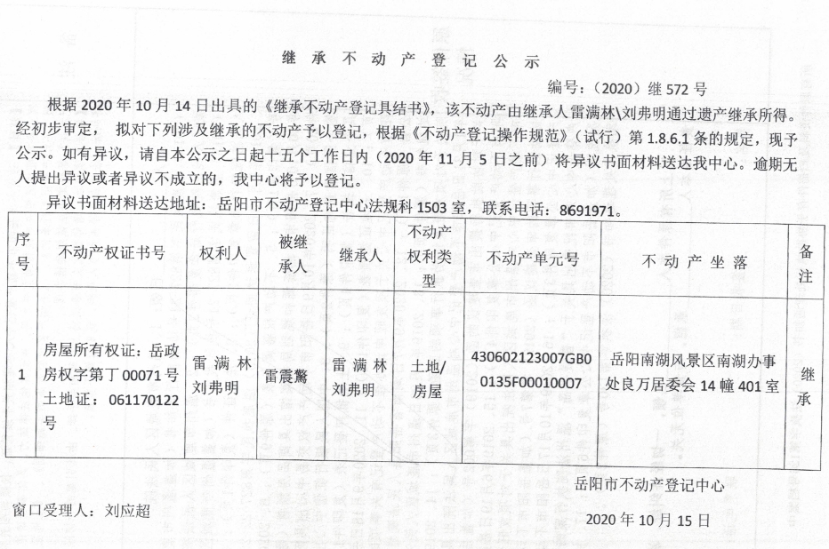继承(受遗赠)不动产登记公告(雷满林)