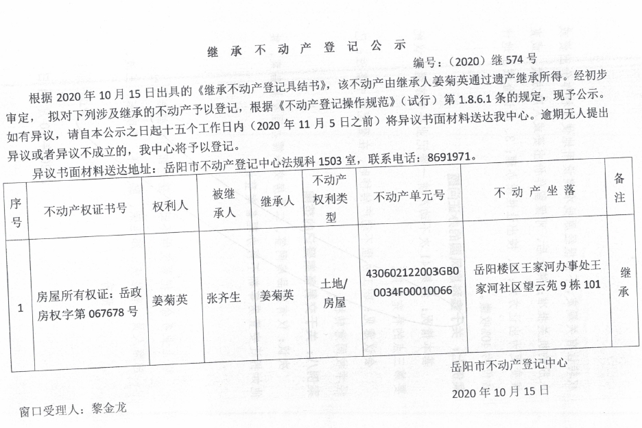 继承(受遗赠)不动产登记公告(姜菊英)