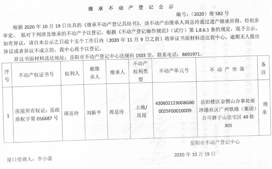 继承(受遗赠)不动产登记公告(周岳玲)