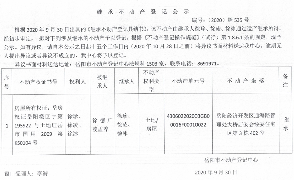 继承(受遗赠)不动产登记公告(徐冰)