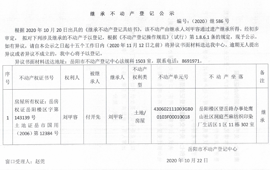 继承(受遗赠)不动产登记公告(刘甲容)