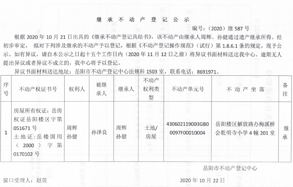 继承(受遗赠)不动产登记公告(孙健)