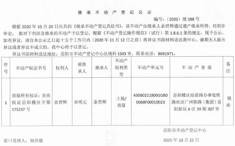 继承(受遗赠)不动产登记公告(余军辉)