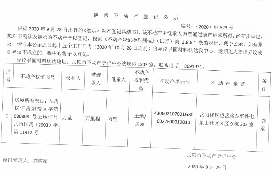 继承(受遗赠)不动产登记公告(万莹)