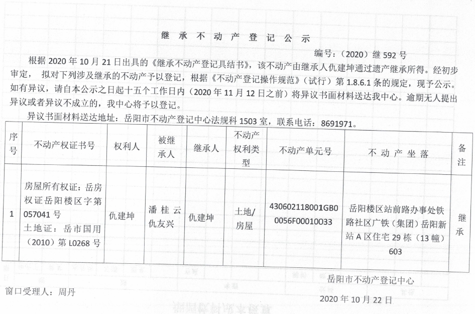 继承(受遗赠)不动产登记公告(仇建坤)