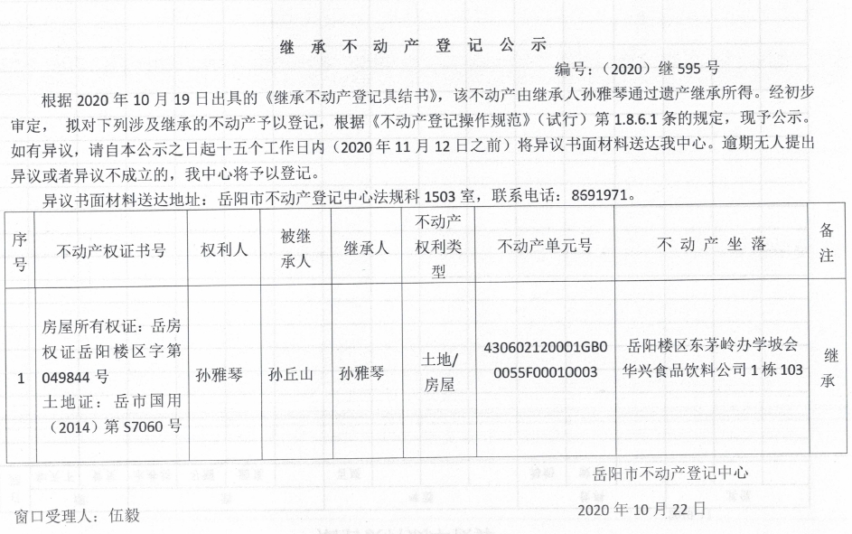 继承(受遗赠)不动产登记公告(孙雅琴)